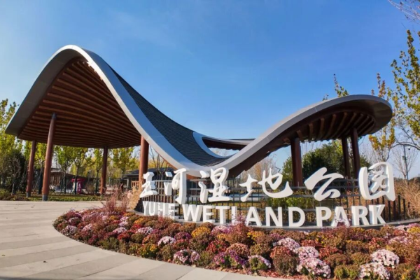 2025년 가을 개방된 옥하습지공원(玉河湿地公园) 내에는 깨끗한 백사장이 있다. 옥하습지공원은 총면적 85.04ha다. 탁 트인 맑은 '옥호(玉湖)'는 공원 전체의 시각적 중심이 된다. 두 개의 긴 제방이 구불구불 호수면을 감싸고 있으며, 열두 개의 작은 섬이 있다. 섬과 섬 사이는 조형미가 아름다운 다리로 연결되어 있다.